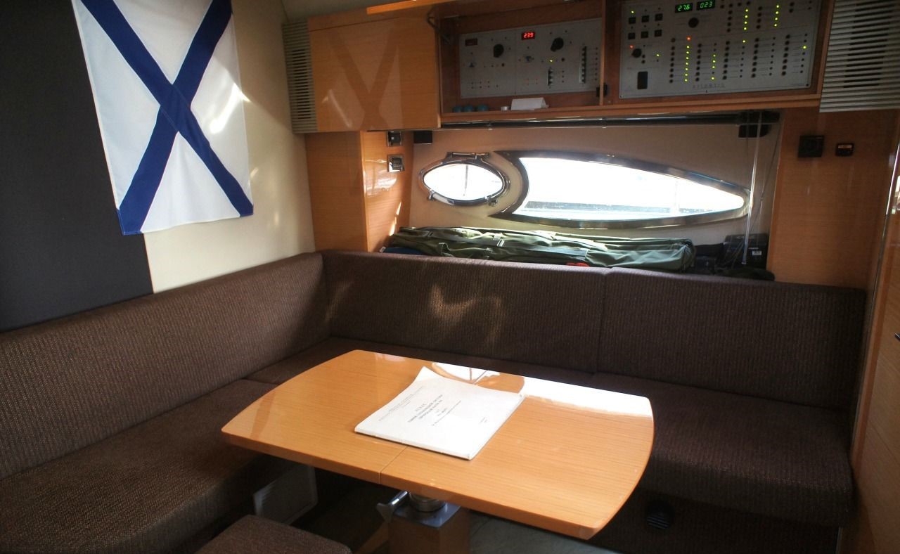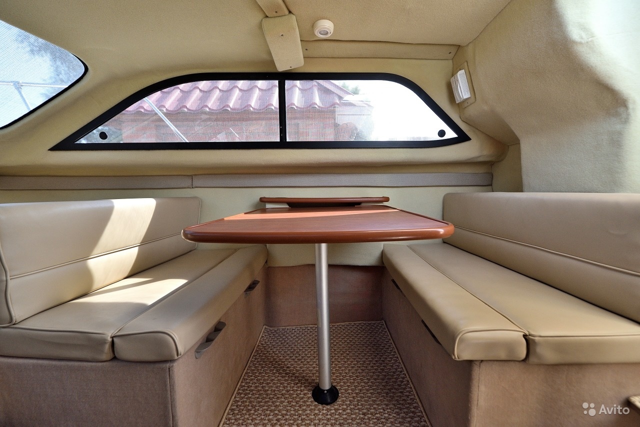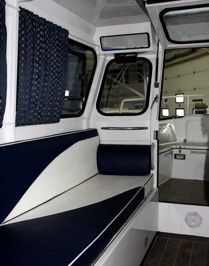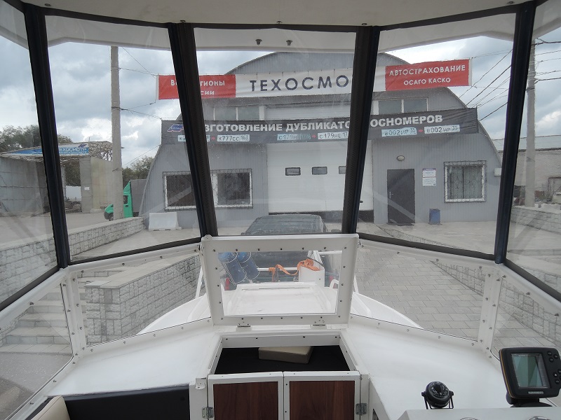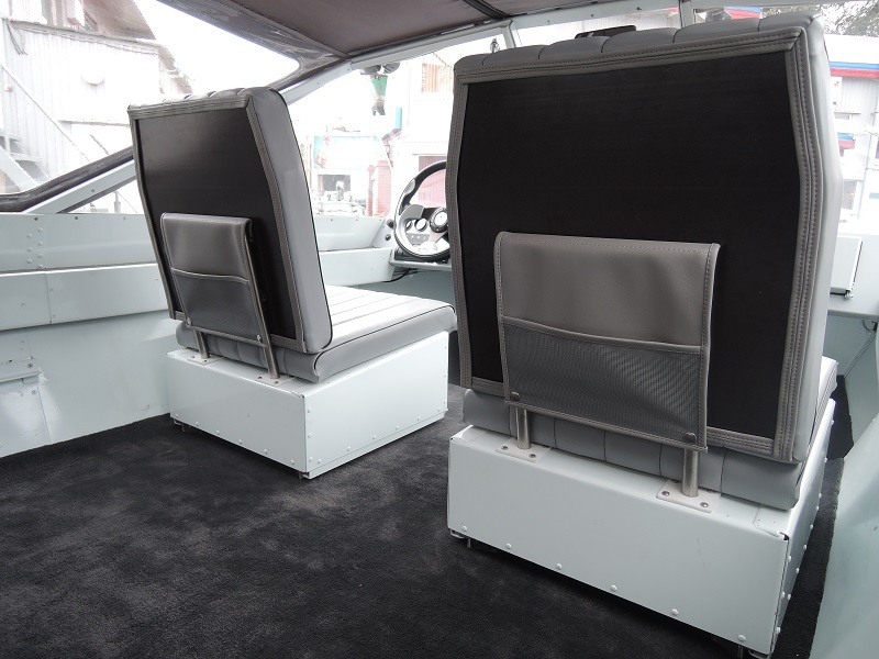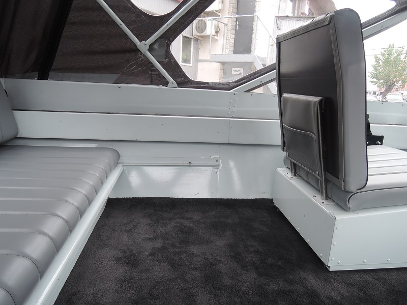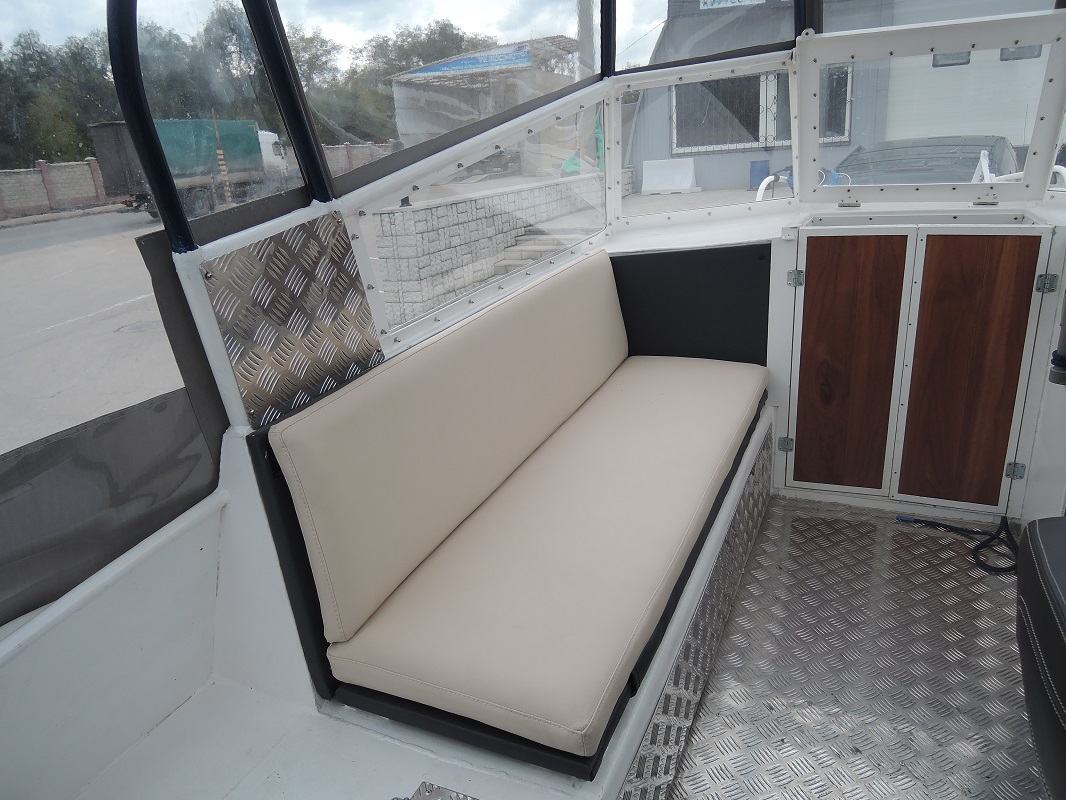 Обрел новый ходовой тент с персональной вышивкой, и удобными карманами для снаряжения. Диван обтянули морской кожей, установили специальное сидение на пневмоподвеске, так же обтянули кожей. Гравировка на панели из нержавеющей стали, подняли потолок, часть пола опустили, чтобы высокий капитан комфортно чувствовал себя на катере. Изготовили новый полнотелый нос для Яхты.