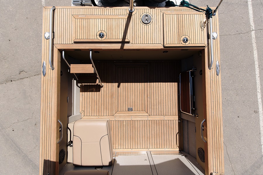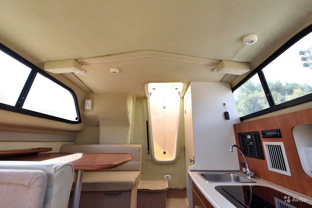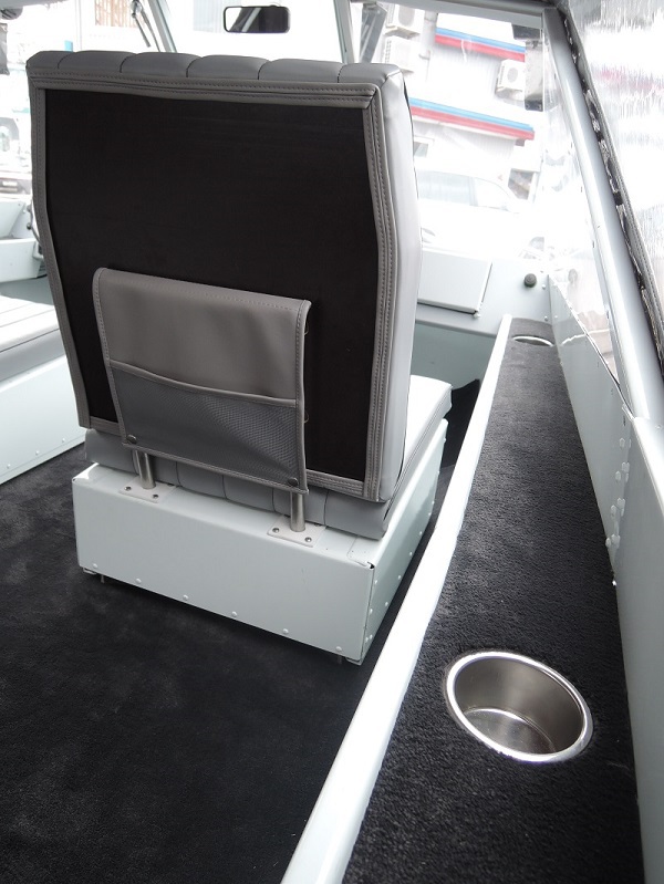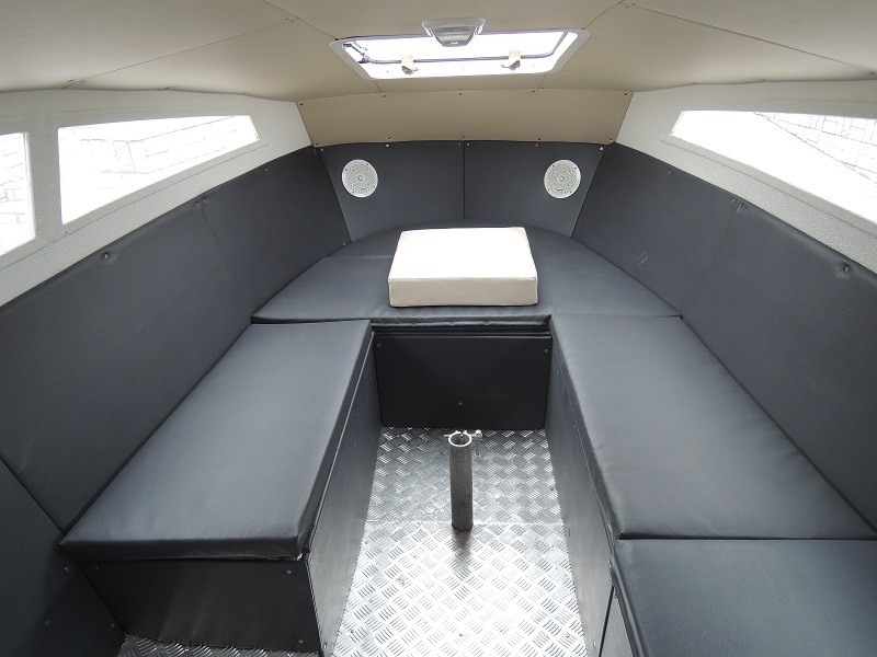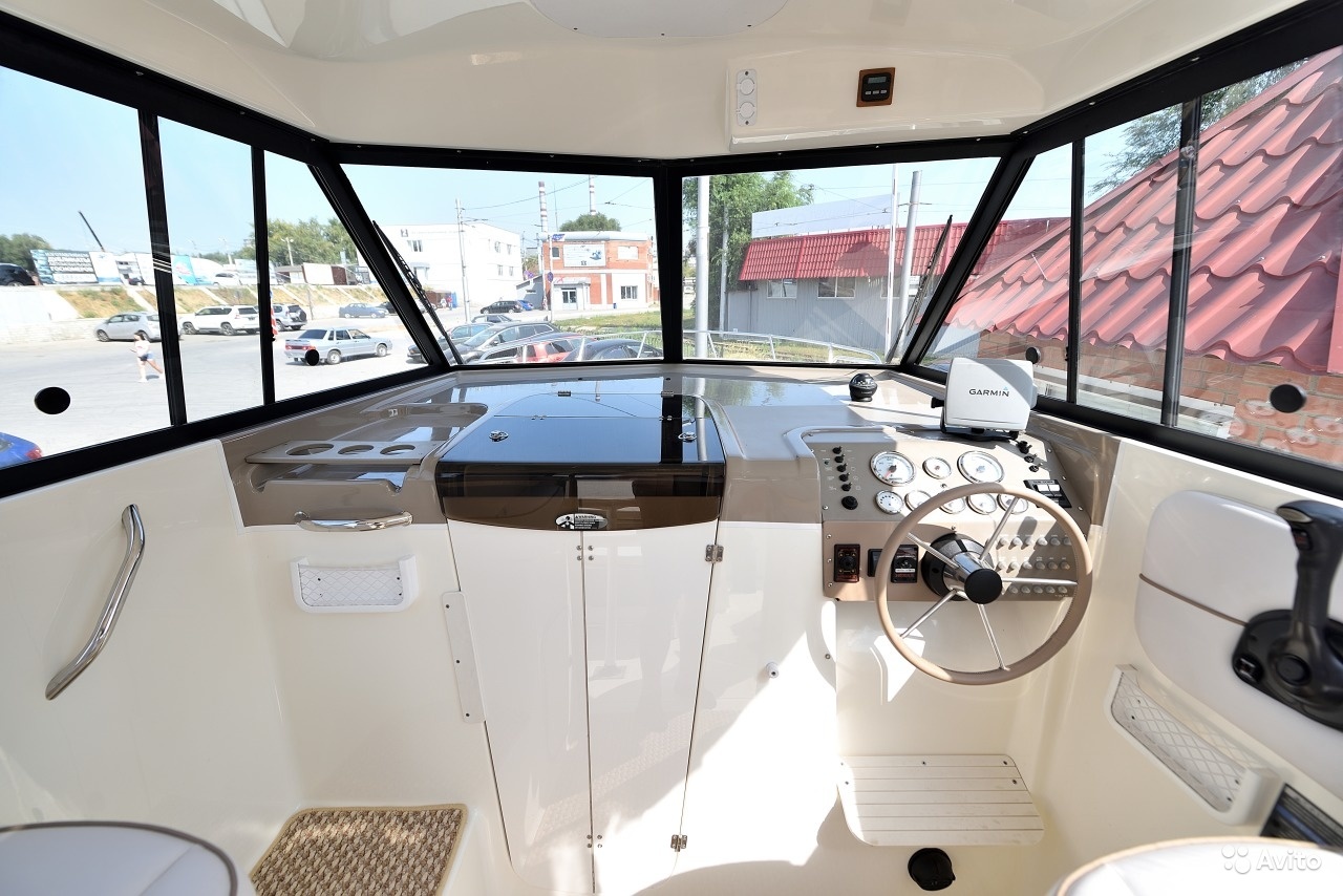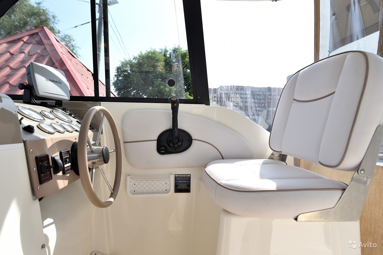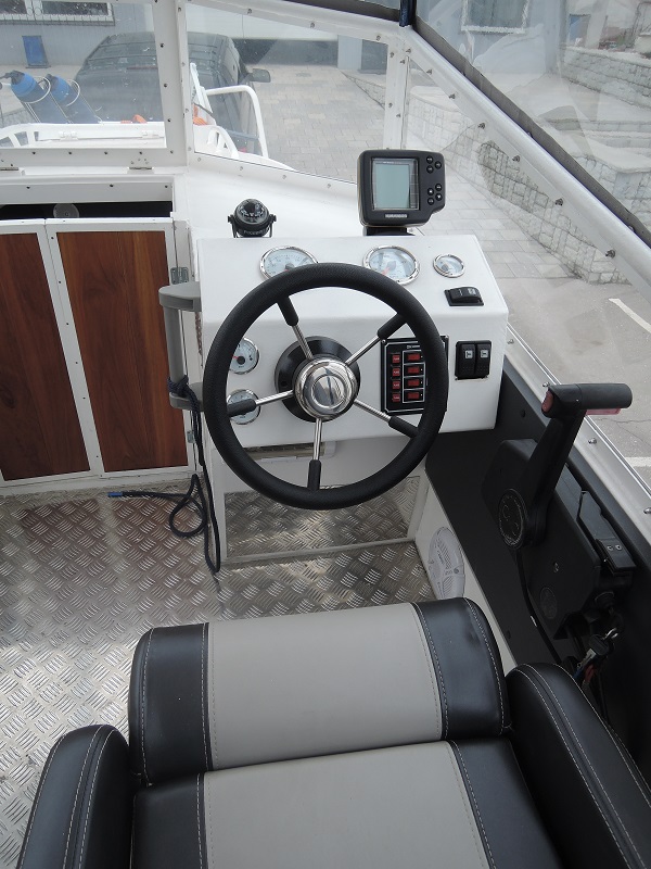 Обрел новый ходовой тент с персональной вышивкой, и удобными карманами для снаряжения. Диван обтянули морской кожей, установили специальное сидение на пневмоподвеске, так же обтянули кожей. Гравировка на панели из нержавеющей стали, подняли потолок, часть пола опустили, чтобы высокий капитан комфортно чувствовал себя на катере. Изготовили новый полнотелый нос для Яхты.