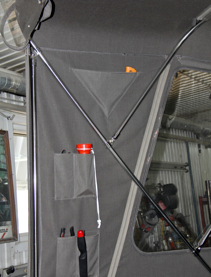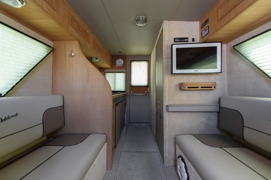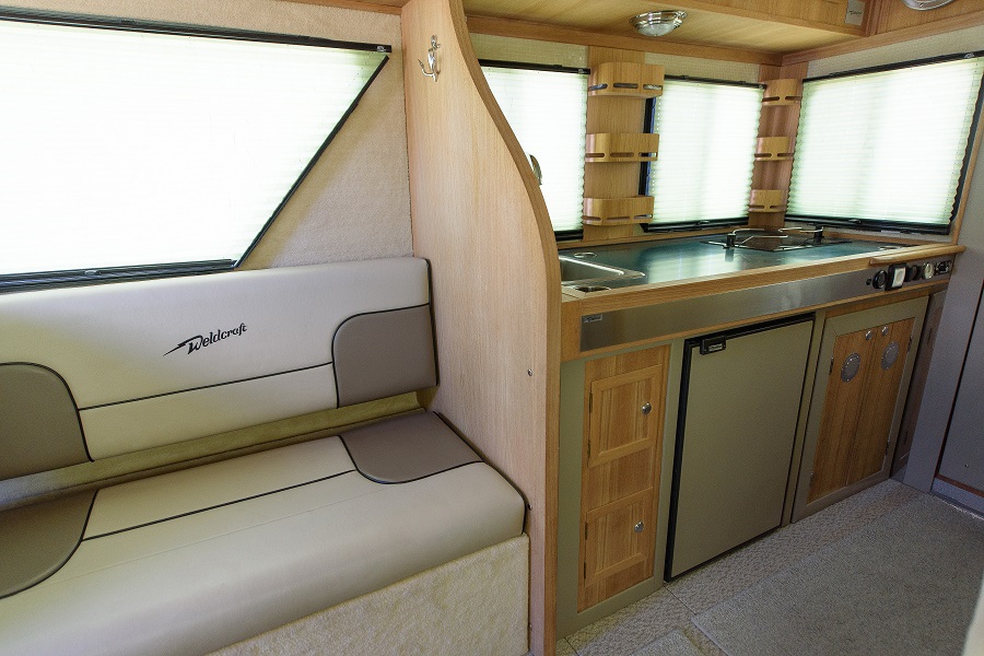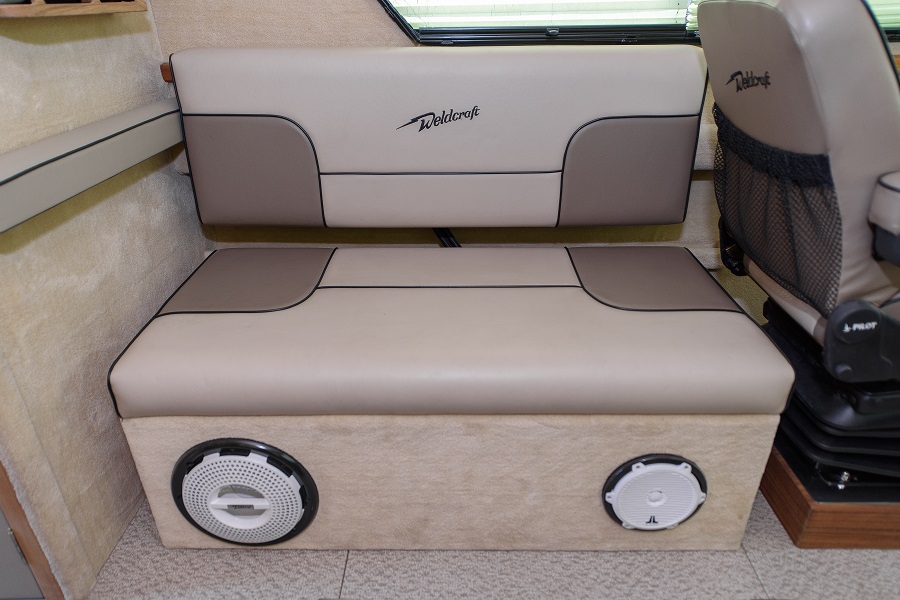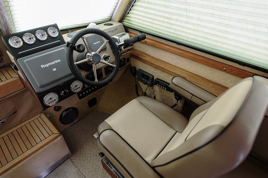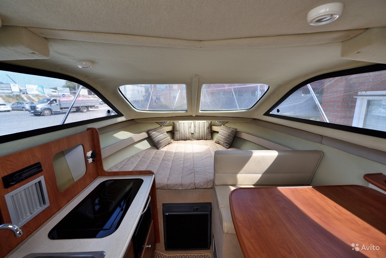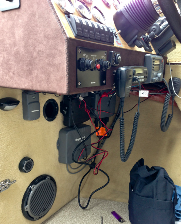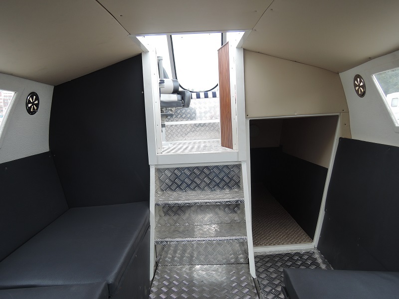 Обрел новый ходовой тент с персональной вышивкой, и удобными карманами для снаряжения. Диван обтянули морской кожей, установили специальное сидение на пневмоподвеске, так же обтянули кожей. Гравировка на панели из нержавеющей стали, подняли потолок, часть пола опустили, чтобы высокий капитан комфортно чувствовал себя на катере. Изготовили новый полнотелый нос для Яхты.