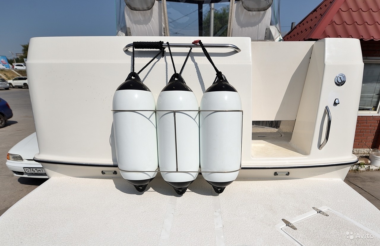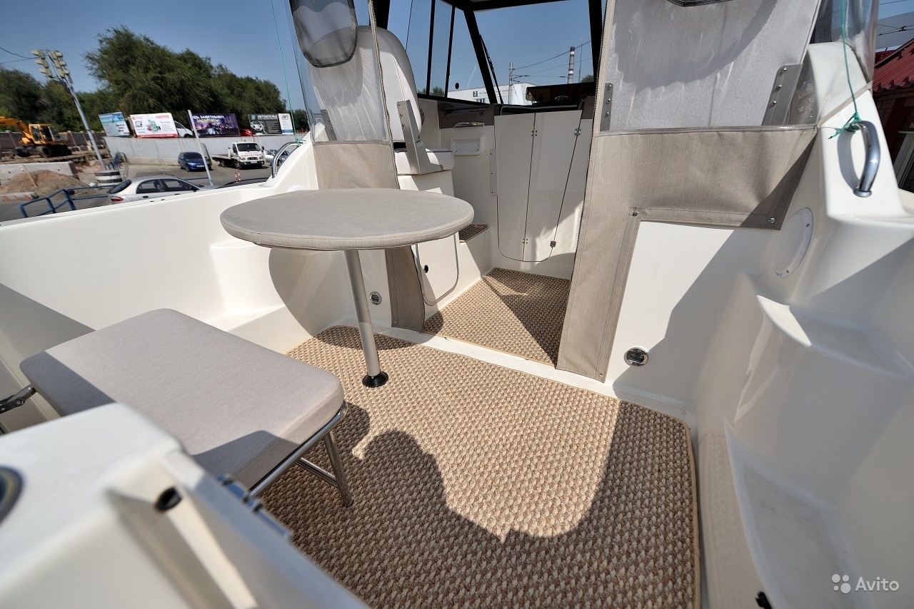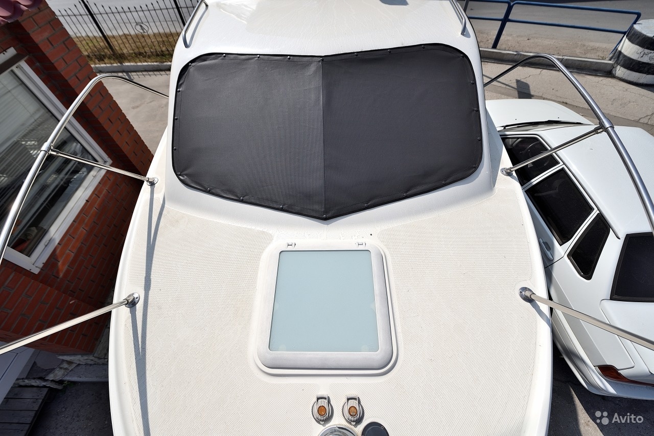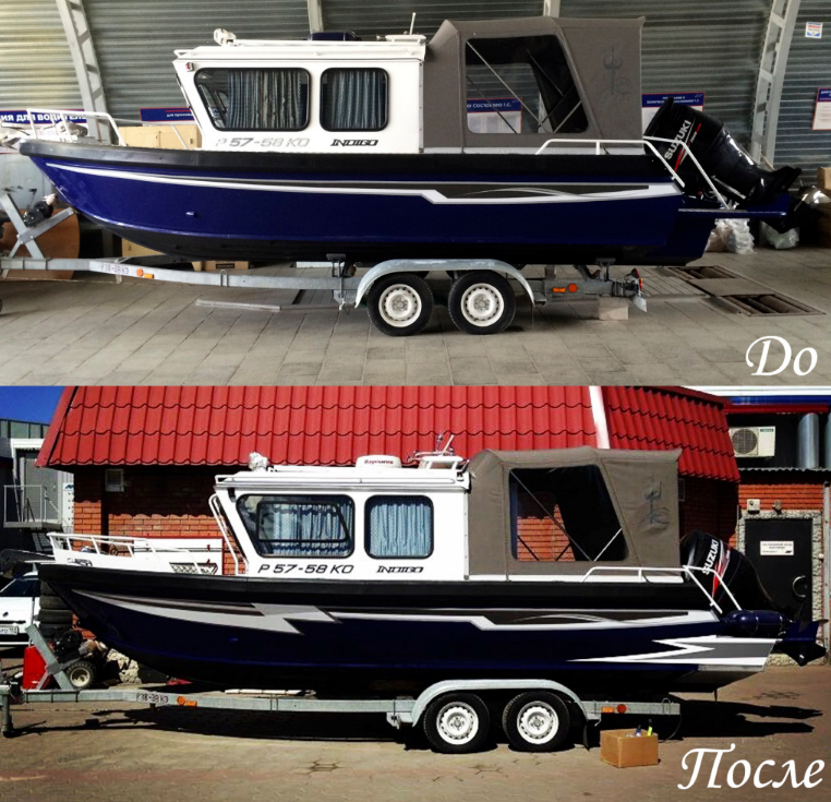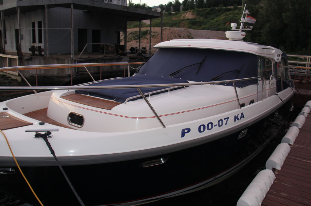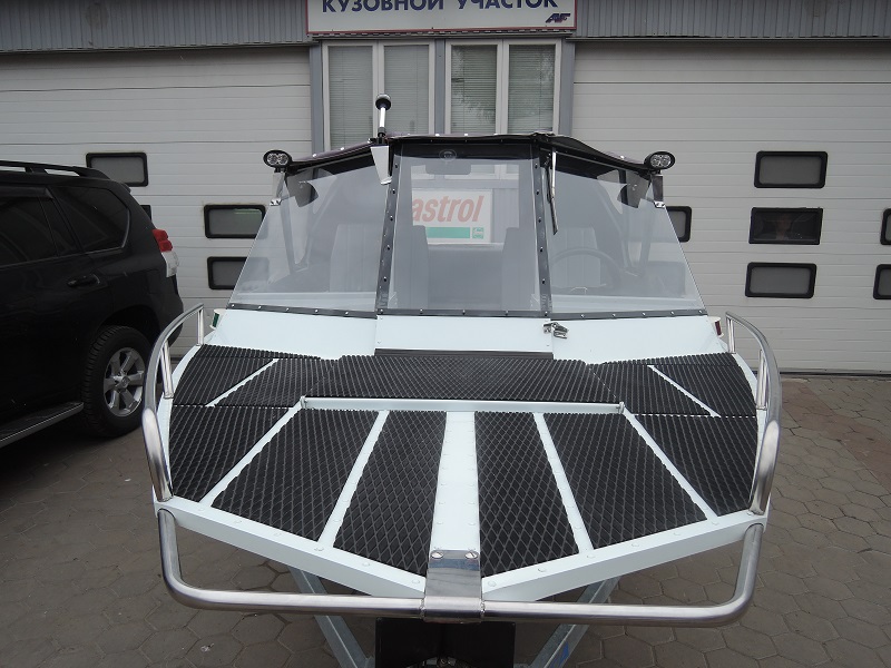 Установлены светодиодные фары для подсветки якоря, защитные элементы из нержавеющей стали для защиты корпуса от ударов якоря. Изготовлены: жесткая крыша (морская фанера, стеклопластик, покрытие гелькоут), удлиненная купальная платформа (морская фанера, стеклопластик, покрытие бирманский ТИК, гелькоут), место для отдыха-загара (ткань санбрелла), защитный тент для него, нос покрыт Бирманским ТИКом. Изготовлена декоративная решетка для маскировки дефекта корпуса (стеклопластик). Полная полировка корпуса специальными составами. Крышки вещевых ящиков покрыли картоном по технологии Аквапринт. Изменили сидение, обшили новым материалом, изменили форму. Установлен пневмосигнал, рейтинги из нержавеющей стали, фара-искатель, телевизионная антенна. Установлено носовое подруливающее устройство. Тент ходовой с каркасами полностью изготовлен заново.