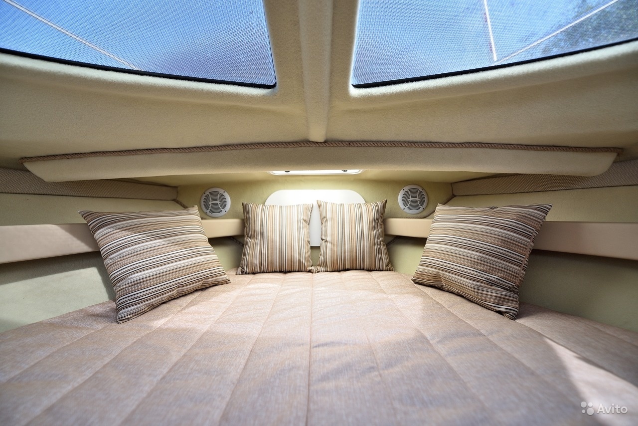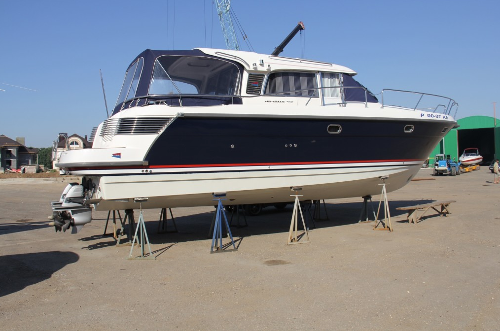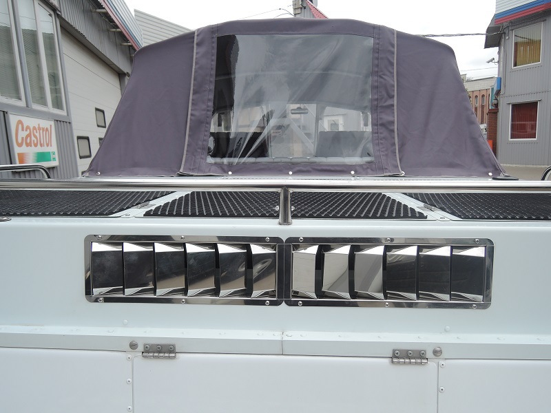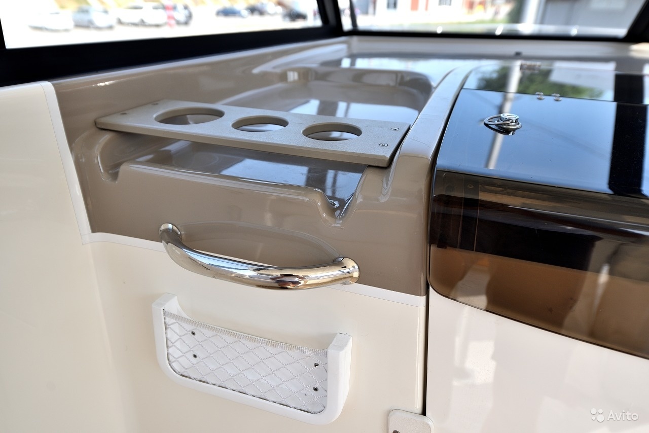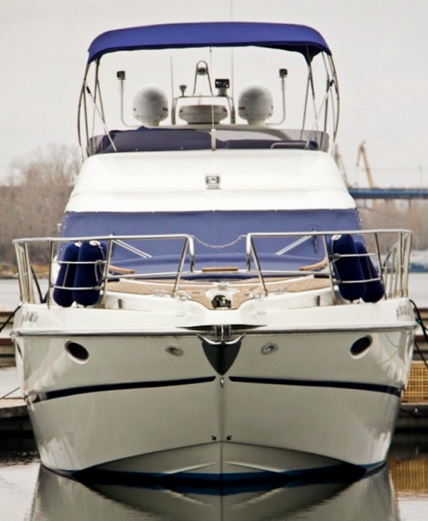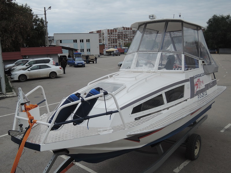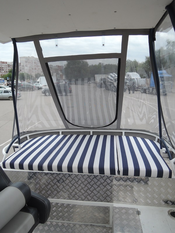 Установлены светодиодные фары для подсветки якоря, защитные элементы из нержавеющей стали для защиты корпуса от ударов якоря. Изготовлены: жесткая крыша (морская фанера, стеклопластик, покрытие гелькоут), удлиненная купальная платформа (морская фанера, стеклопластик, покрытие бирманский ТИК, гелькоут), место для отдыха-загара (ткань санбрелла), защитный тент для него, нос покрыт Бирманским ТИКом. Изготовлена декоративная решетка для маскировки дефекта корпуса (стеклопластик). Полная полировка корпуса специальными составами. Крышки вещевых ящиков покрыли картоном по технологии Аквапринт. Изменили сидение, обшили новым материалом, изменили форму. Установлен пневмосигнал, рейтинги из нержавеющей стали, фара-искатель, телевизионная антенна. Установлено носовое подруливающее устройство. Тент ходовой с каркасами полностью изготовлен заново.
