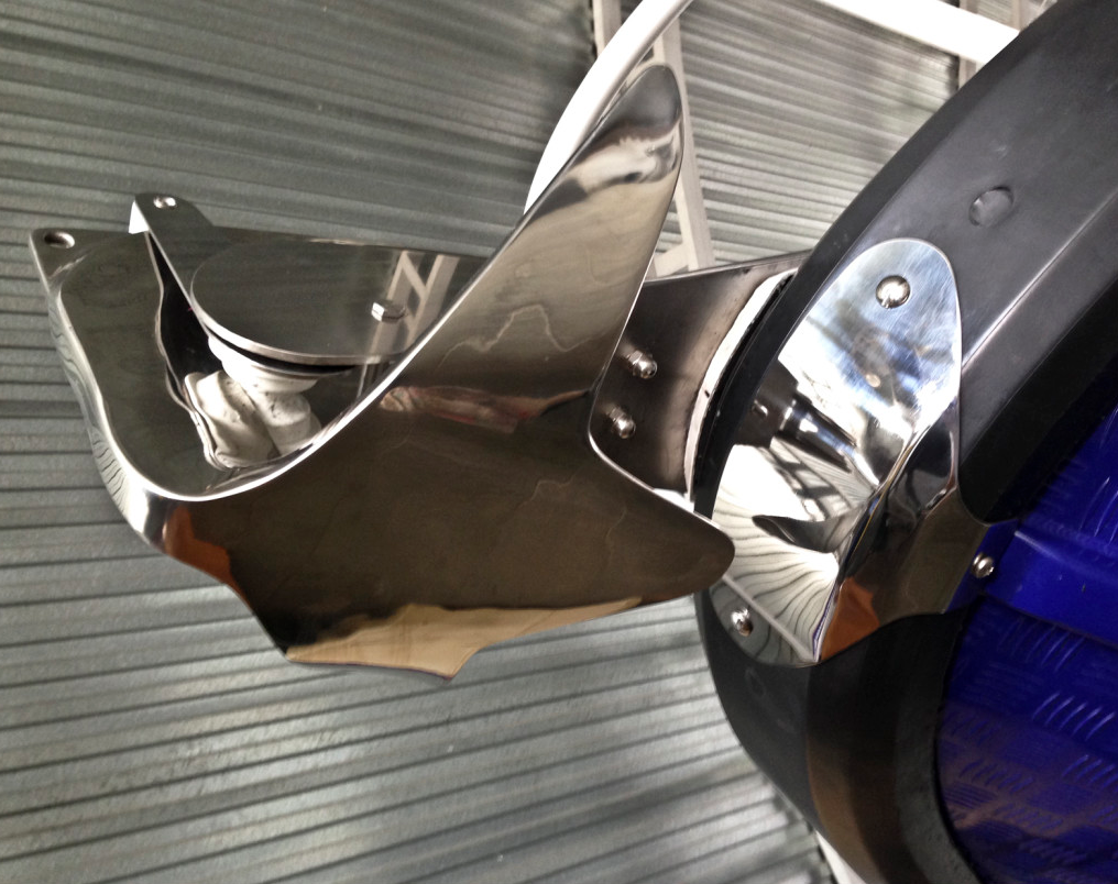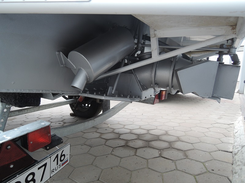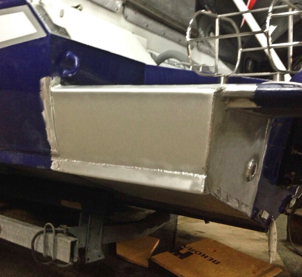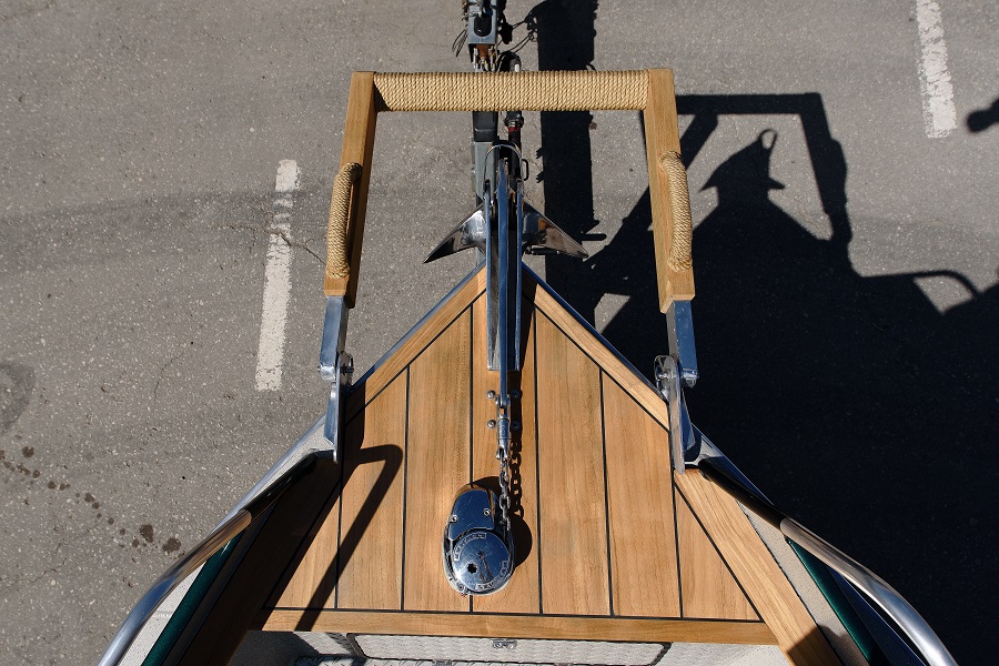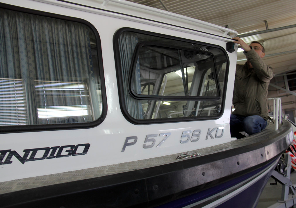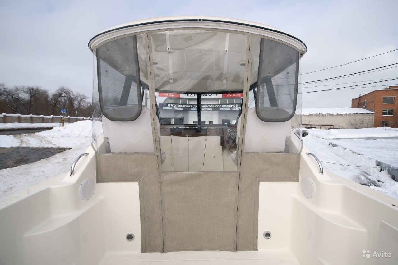 Установлены светодиодные фары для подсветки якоря, защитные элементы из нержавеющей стали для защиты корпуса от ударов якоря. Изготовлены: жесткая крыша (морская фанера, стеклопластик, покрытие гелькоут), удлиненная купальная платформа (морская фанера, стеклопластик, покрытие бирманский ТИК, гелькоут), место для отдыха-загара (ткань санбрелла), защитный тент для него, нос покрыт Бирманским ТИКом. Изготовлена декоративная решетка для маскировки дефекта корпуса (стеклопластик). Полная полировка корпуса специальными составами. Крышки вещевых ящиков покрыли картоном по технологии Аквапринт. Изменили сидение, обшили новым материалом, изменили форму. Установлен пневмосигнал, рейтинги из нержавеющей стали, фара-искатель, телевизионная антенна. Установлено носовое подруливающее устройство. Тент ходовой с каркасами полностью изготовлен заново.