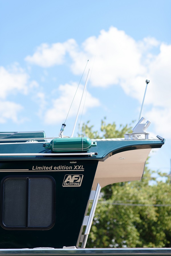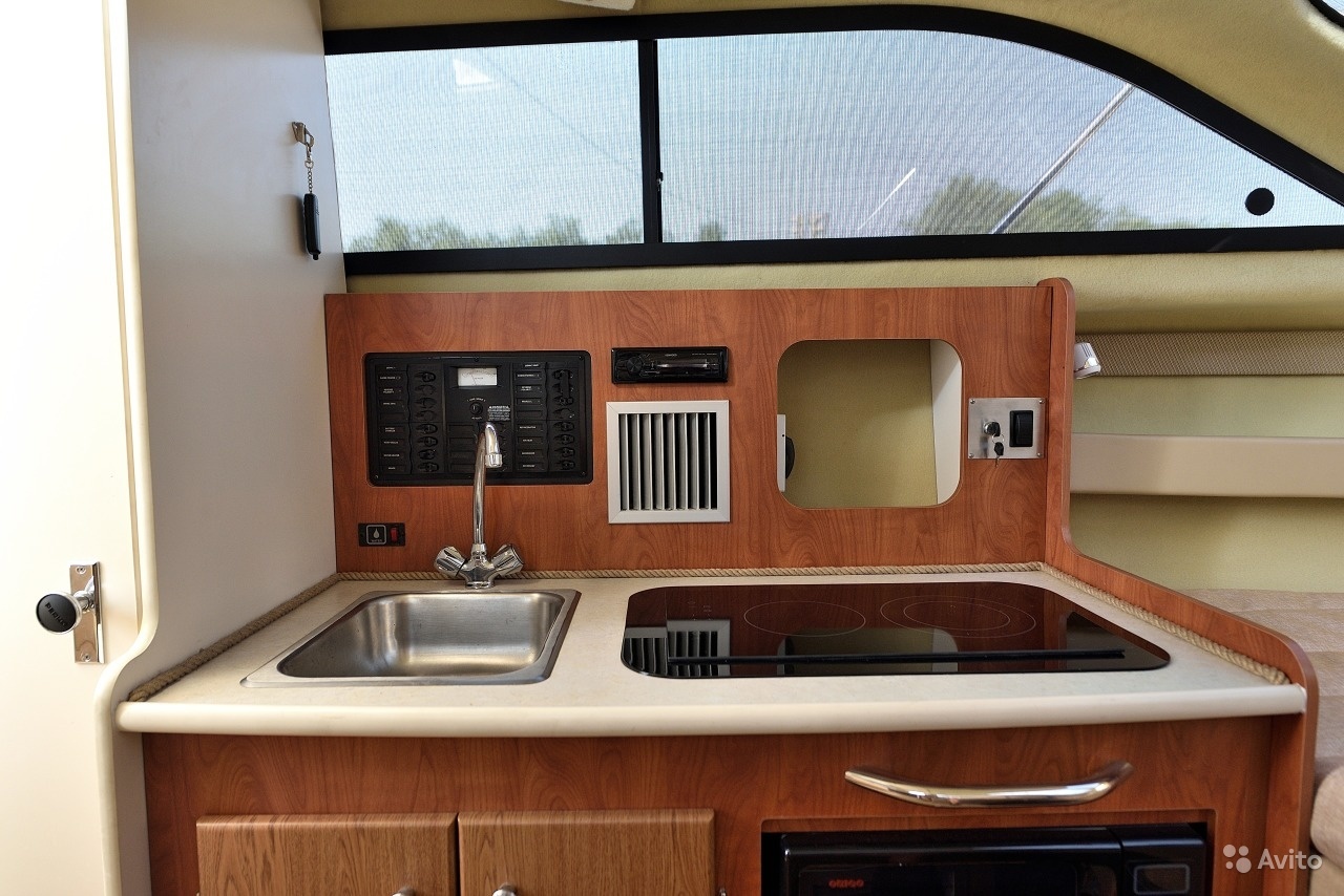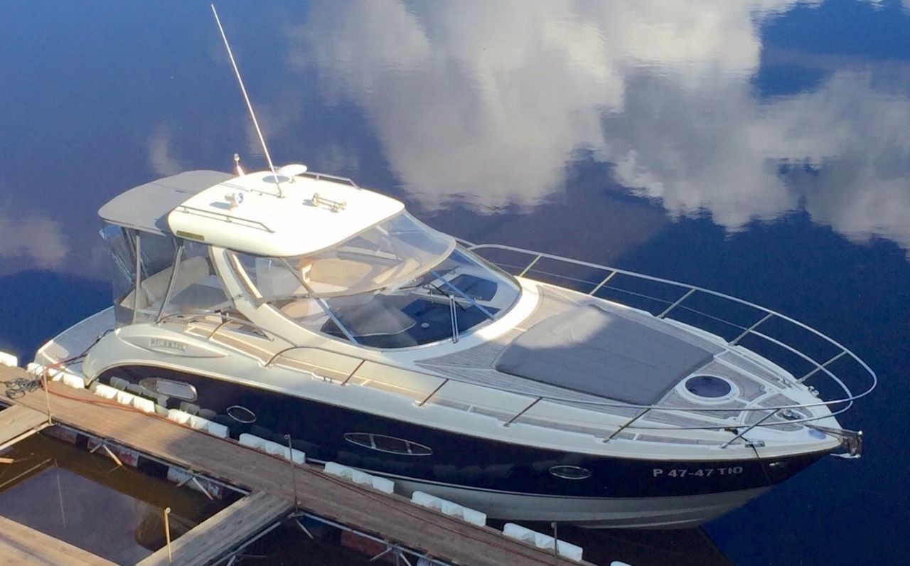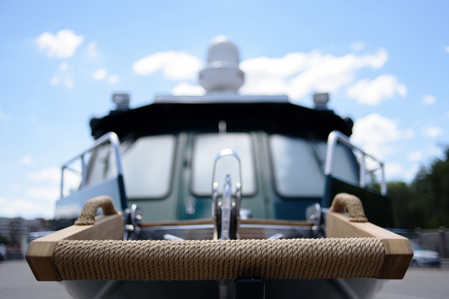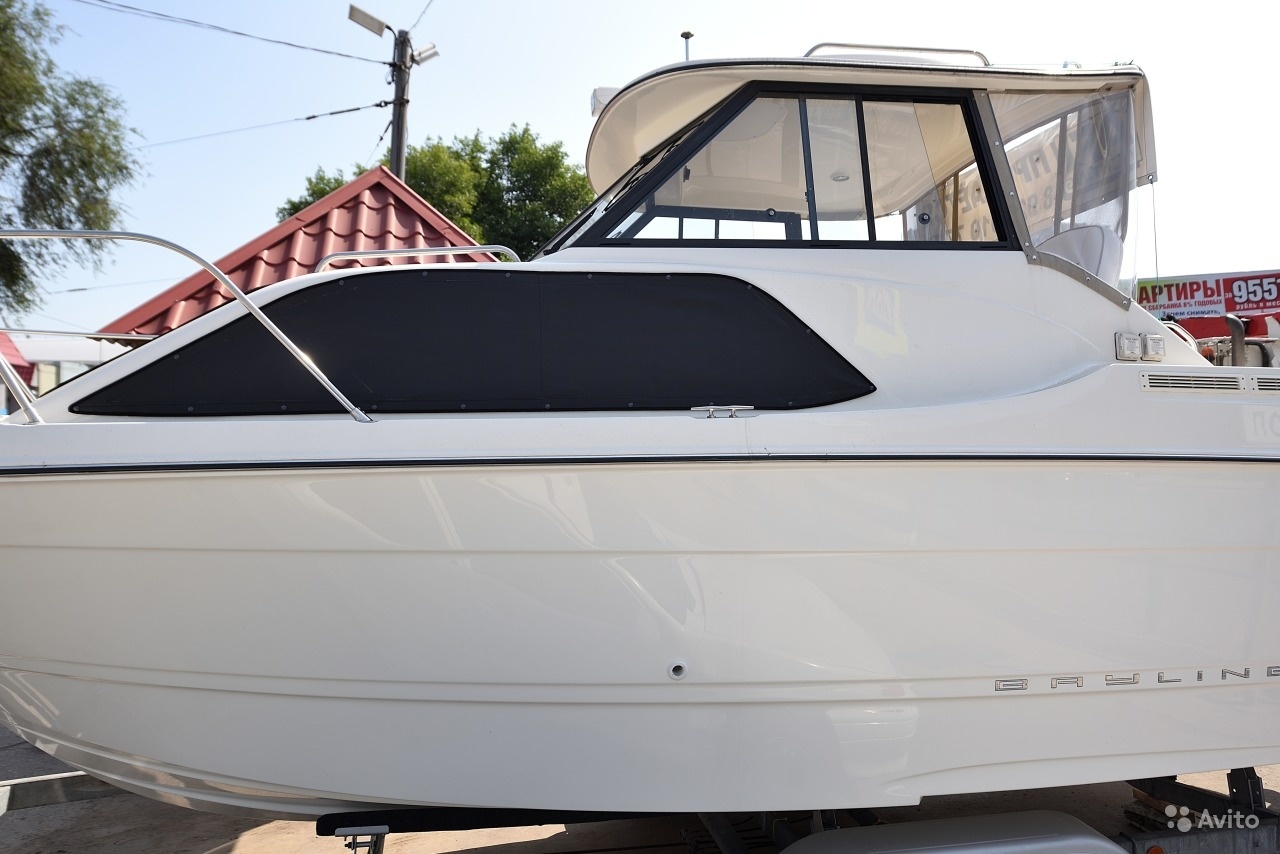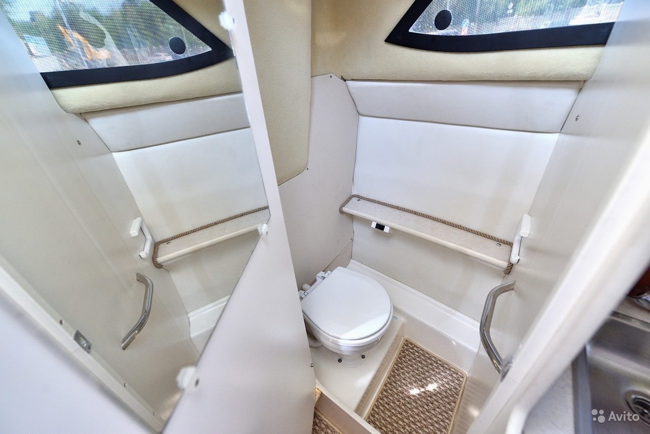 Установлены светодиодные фары для подсветки якоря, защитные элементы из нержавеющей стали для защиты корпуса от ударов якоря. Изготовлены: жесткая крыша (морская фанера, стеклопластик, покрытие гелькоут), удлиненная купальная платформа (морская фанера, стеклопластик, покрытие бирманский ТИК, гелькоут), место для отдыха-загара (ткань санбрелла), защитный тент для него, нос покрыт Бирманским ТИКом. Изготовлена декоративная решетка для маскировки дефекта корпуса (стеклопластик). Полная полировка корпуса специальными составами. Крышки вещевых ящиков покрыли картоном по технологии Аквапринт. Изменили сидение, обшили новым материалом, изменили форму. Установлен пневмосигнал, рейтинги из нержавеющей стали, фара-искатель, телевизионная антенна. Установлено носовое подруливающее устройство. Тент ходовой с каркасами полностью изготовлен заново.