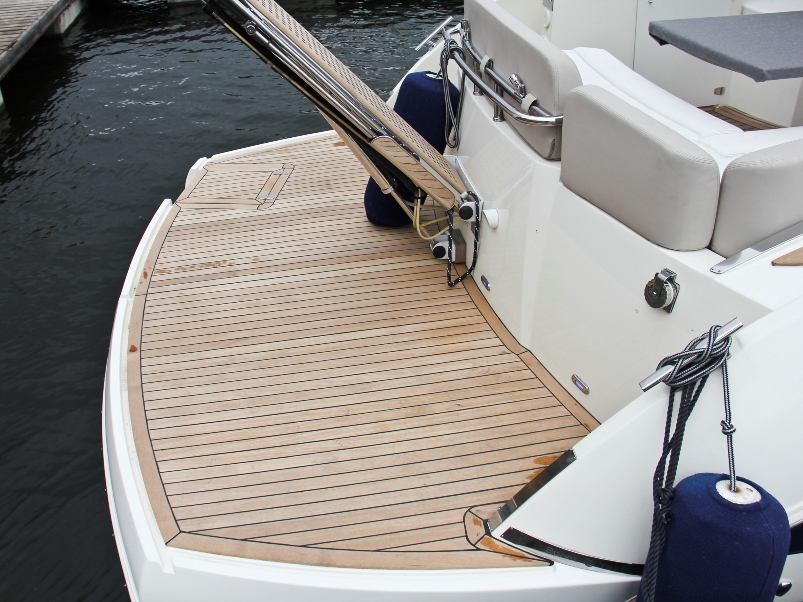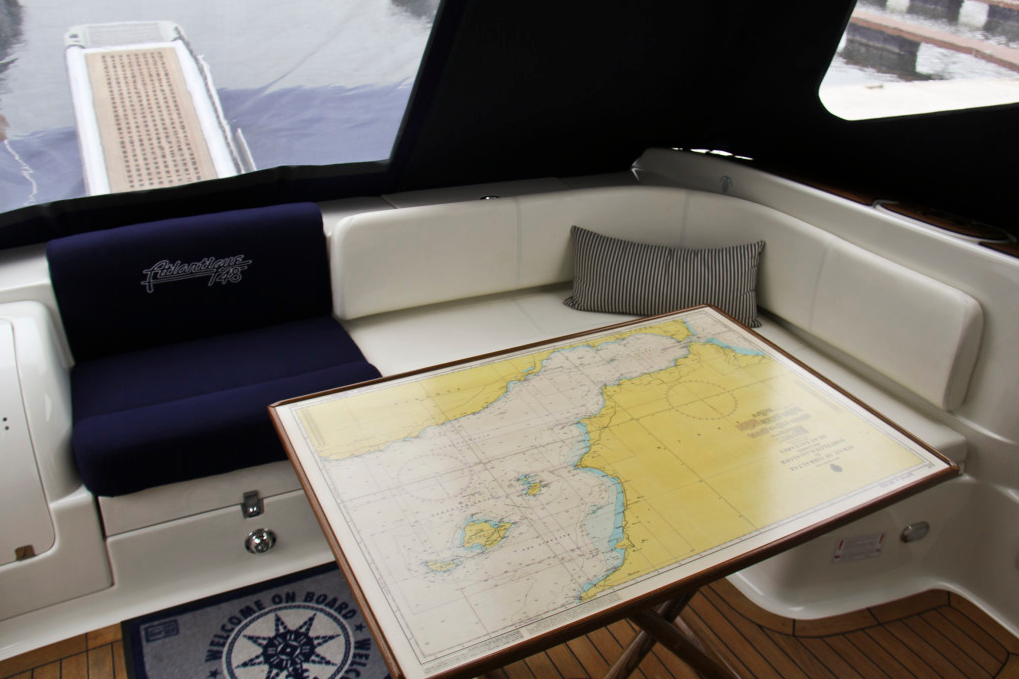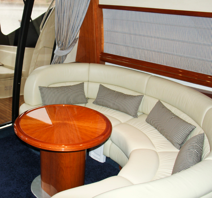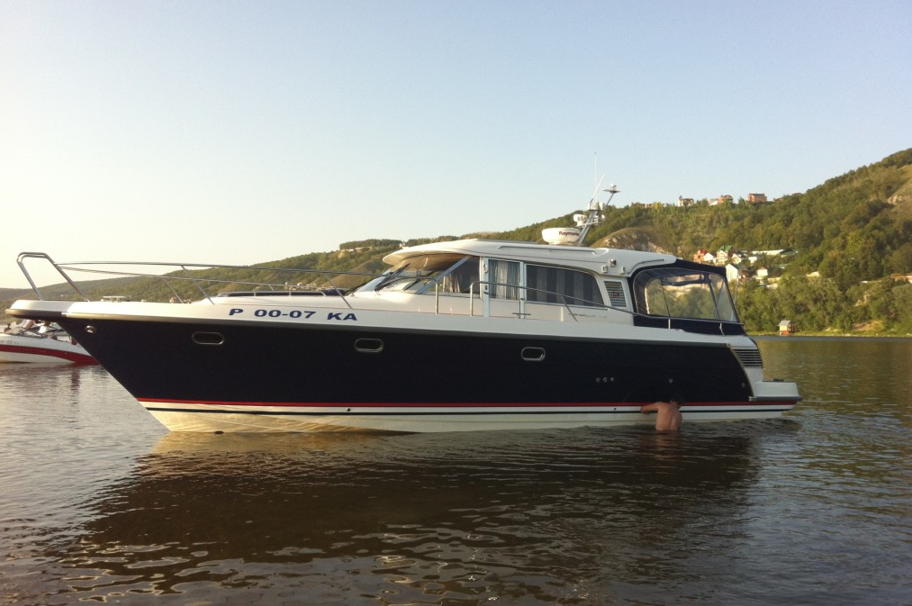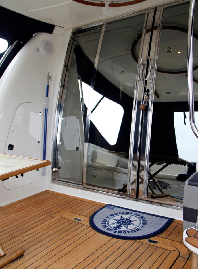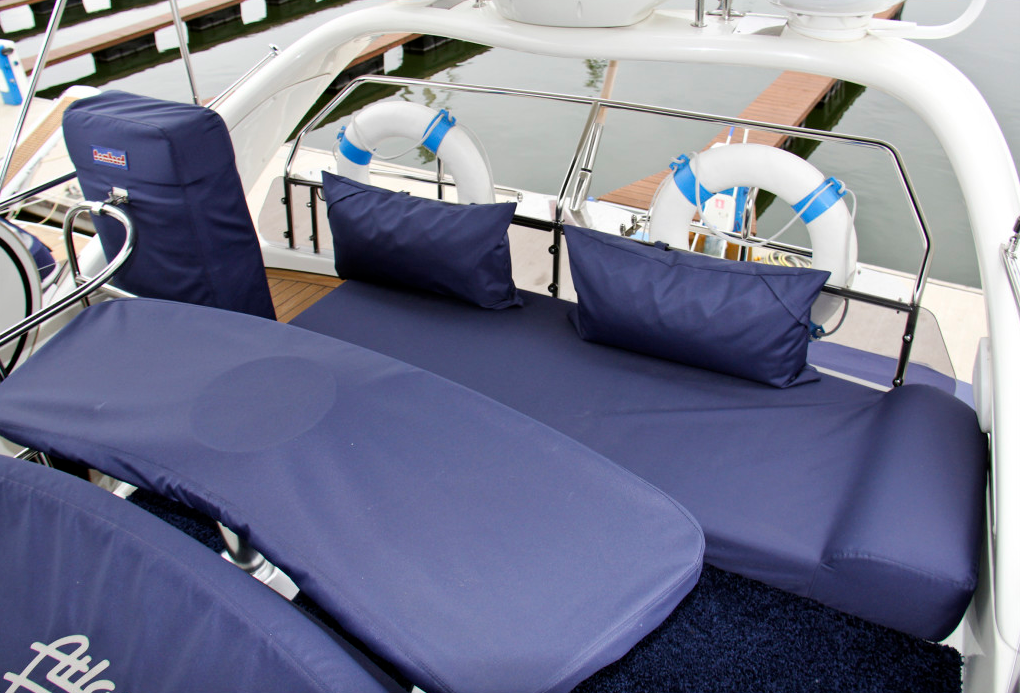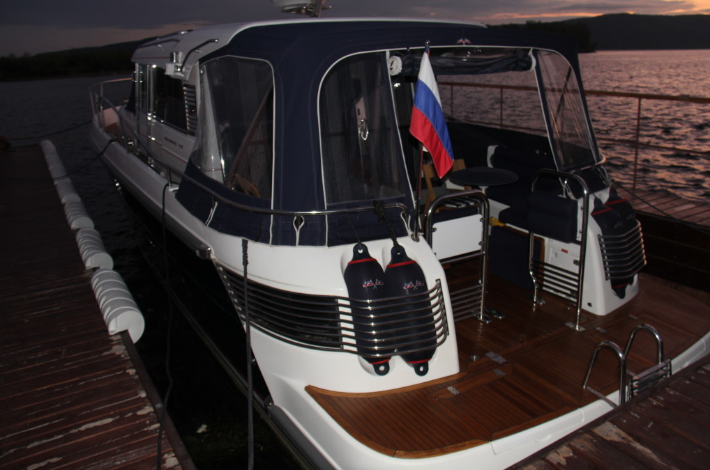 Изменили форму малого дивана, материал обивки. Перешили полностью салон. Изменили форму сидения капитана и диванов на корме. Обшили палубу, протопчины, флайбридж тиком, изготовили место для загараотдыха на носу. Установили кормовое подруливающее устройство. На купальной платформе изготовили дубовые кильблоки для Зодиака, (РИБ). Флайбридж: изготовили стол и дополнительный диван. Изготовили новый стояночный, защитные и ходовой тенты. Штатный нос из пластика заменили на новый, покрыли его тиком и изготовили место для загара.